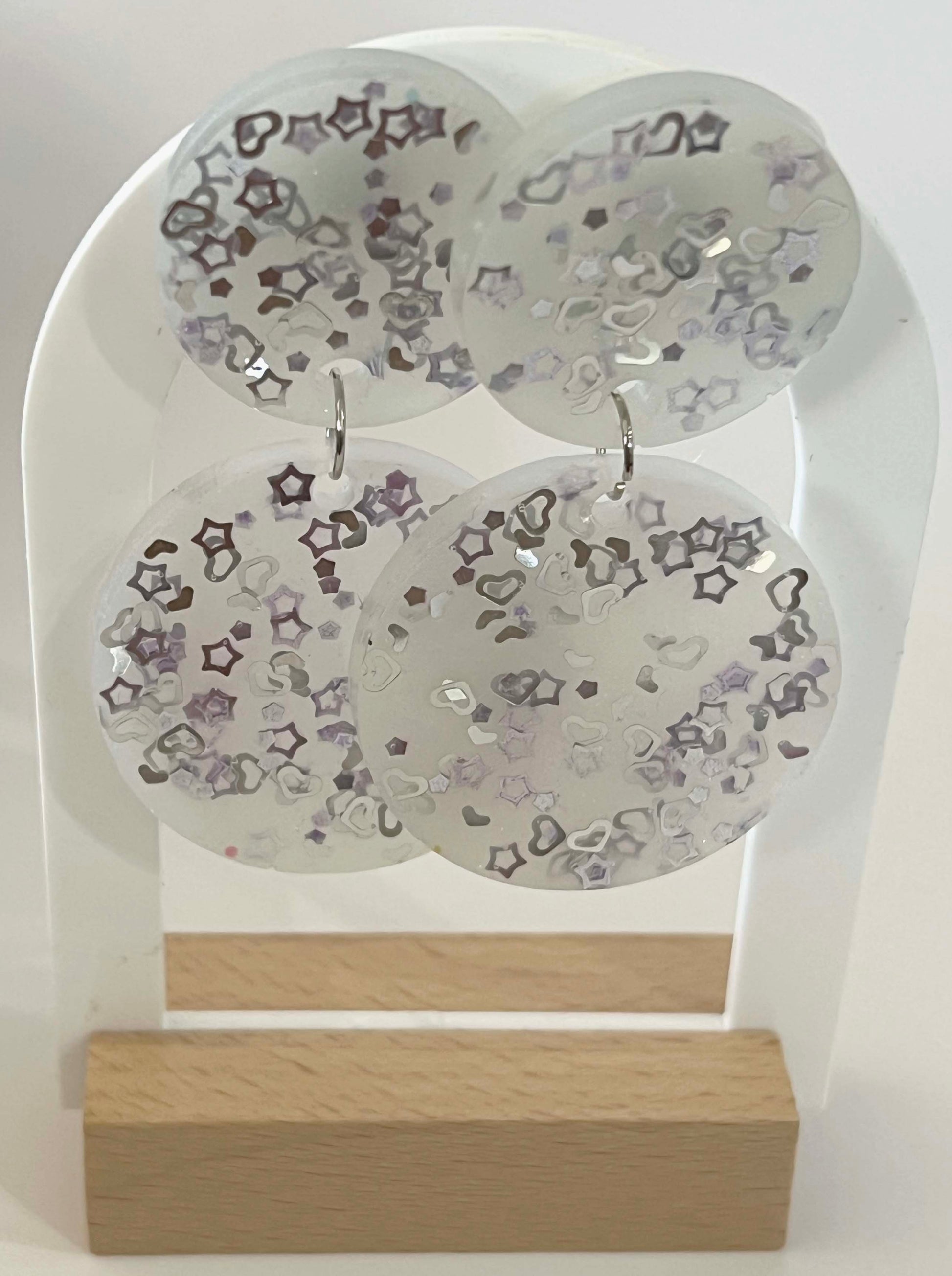A pair of cosmic inspired earrings of large circles with white sparkly colour mixed with silver glitter shapes in resin. These big circles hang from two medium circles made up of the same resin mixture. The post are surgical grade steel. Top circles measure approximately 2.8cm wide and large circles measure approximately 3.6cm wide.