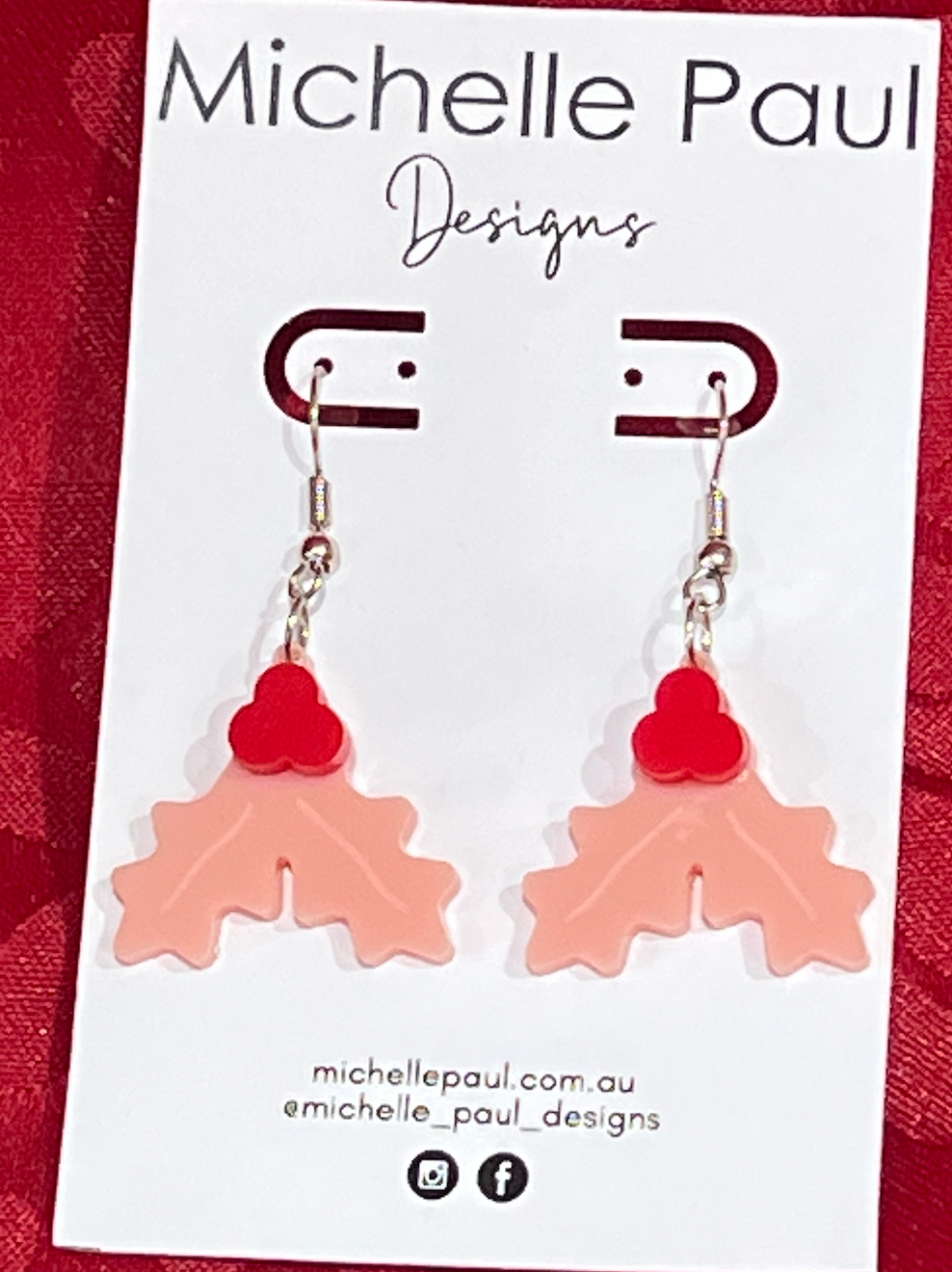 Decorate your ears with these pale pink coloured Holly with red berry earrings for Christmas in July. Earring hooks are surgical grade steel. Please note colours may vary slightly from the picture due to your monitors display.