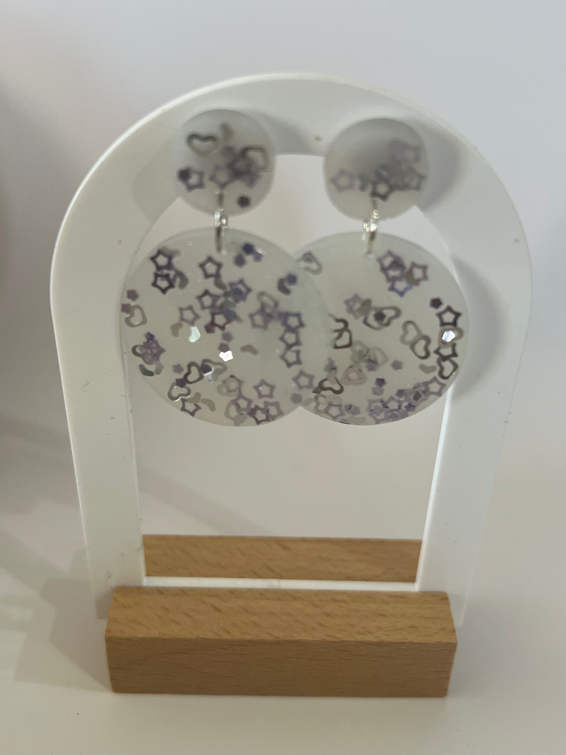 A pair of cosmic inspired moon earrings. A white sparkly colour mixed with silver glitter shapes. These moons hang from two small circulars made up of the same resin mixture. The post are surgical grade steel. Small circles measure approximately 1.2cm wide and large moons measure approximately 3cm wide.